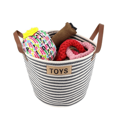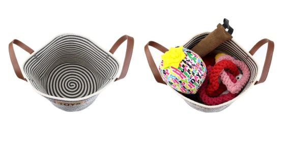 This is a very nice-looking, well-made rope basket. It has way better uses for holding dog toys though. In our house, it did not work as a dog toy "box" because it collapses and doesn't say open. And, while the handles are nice, they aren't ideal on a dog toy basket. Instead, the humans in our house use this for our stuff (works way better).