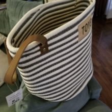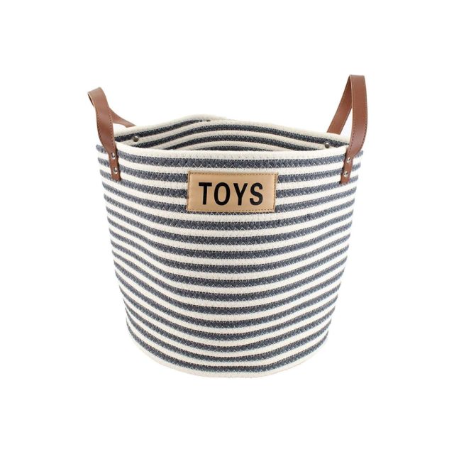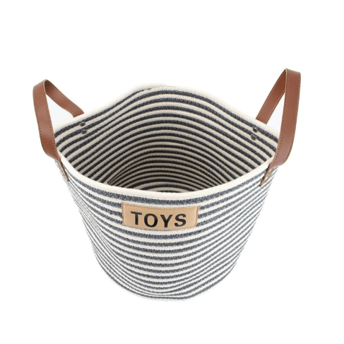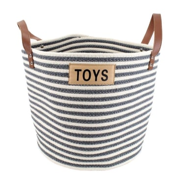 I love this toy basket! It has a great nautical flair that works with our decor. The leather handles, the cute navy and cream striped design, the nice toy placard, all this works together and looks great out in the open, not tucked into the coat closet. I love that our dog's toys have such a cute storage basket in our home. This is well made, stands upright on its own, and is very heavy duty. I expect that it will look great for many many years to come!