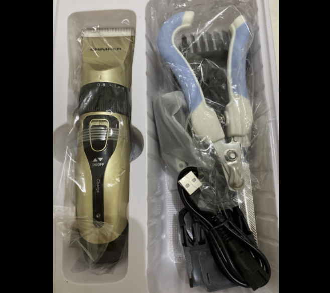 I liked that the set included everything needed for grooming - scissors, different sized combs for the shaver, nail clippers, & a nail file! It also included a tiny brush to clean the inside of the shaver. When you turn on the device, the noise is very low and did not scare any of my dogs. My only complaint is that the charge light for my device never turned green no matter how long I charged it for (and I even kept an eye on it because the recommended charge time was 3 hours). Still, it was completely functional and easy to use. Make sure to use the scissors to trim long fur before going in with the shaver. The fur does get everywhere, so I usually go out into the garden and put my dog on a little table so that he won't move around as much. Also, clean the inside after each use so that the device doesn't get clogged. It's super easy to pop the blade portion out and back in! Definitely a great product for dog owners who want to groom at home (especially during the age of Covid, when we can't really go to the groomers'). Worth the investment for this all-in-one grooming kit!
