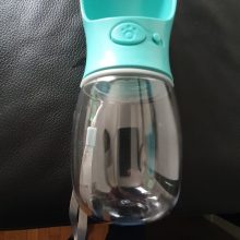 This is a great little dog water bottle that is very convenient! When we travel, I keep it in one of the cup holders because it fits nicely there. It took a few washings to reduce the plasticy smell but it was fine after that.
