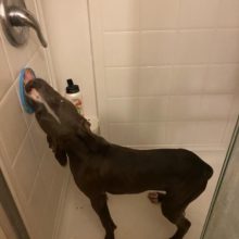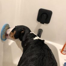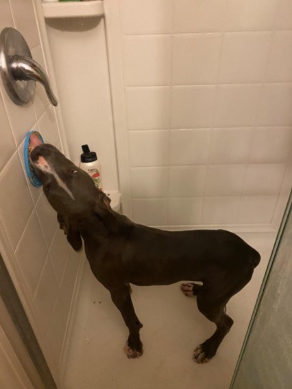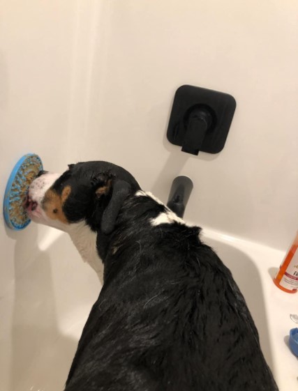 My dog's hatred of baths is too much for this, but it is really helpful when we are using the hair dryer on him. We smear it with peanut butter. The suction is great - sticks to the floor, wall or cabinet.