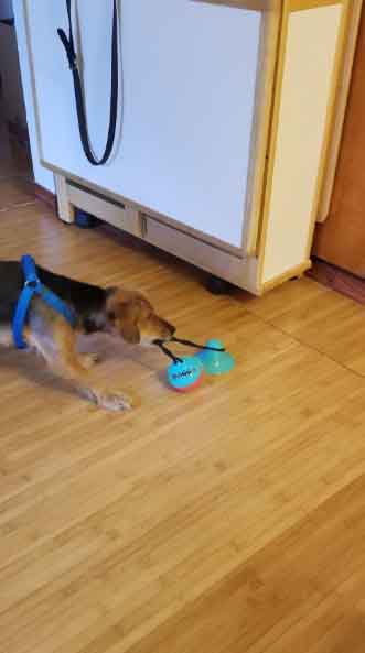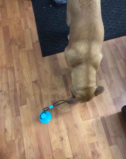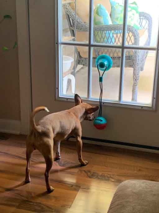 Ha...just noticed my dog looks kinda like the one in the picture for the product! Anyway, she likes this toy. I did figure out that I could put it on the window, and that worked out just fine. She's feisty and loves tug of war, so this is a toy that can take me out of the equation for a little while. THANK YOU! But it is also fun to hold on to the suction end myself and have her play with me. (I'm just glad I don't have to do that alllll the time anymore.) She enjoys tugging at the ball, and also just messing with and hitting the ball and watching it swing. She's so weird. But if she likes it, I love it! This dog will find a way to destroy ANYTHING, and she has not yet been able to kill this toy, so that's a plus.