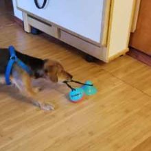 Absolutely hilarious toy! Our 1yr old GSD/Boxer mix is obsessed with it, put it on any flat surface and he'll try to get it off. If you have a larger breed or smart dog, keep an eye on them! They'll figure a way to get the toy off!