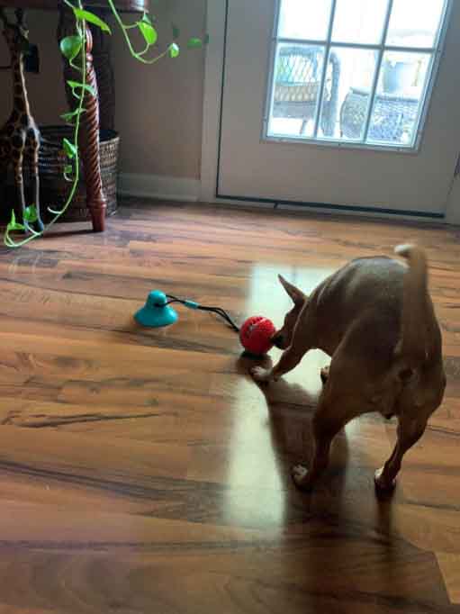 Bought this for my dog who loves chewing up his toys. He pretty much destroys every toy we've bought him within minutes of getting it. I had issues getting this to suction to our hardwood floors so I did put it on our glass door and we had some fun with it. He would play for a while, get bored, and frustrated but then would come back later for more! I worried about him pulling too hard on the glass door so we did find an area in our mudroom where it worked on the floor.